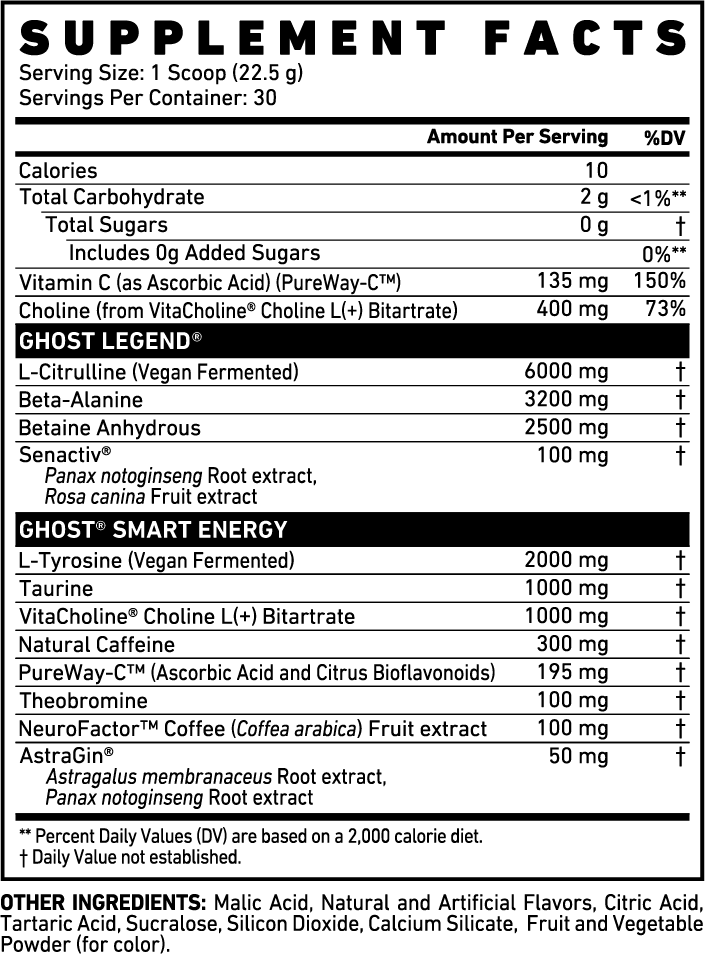 Mix 1 scoop (1 serving) of GHOST LEGEND® with 8-10oz of water or beverage of choice. Vary amount of liquid to taste. Start with 1/2 scoop to assess your tolerance. Consume prior to exercise on training days.